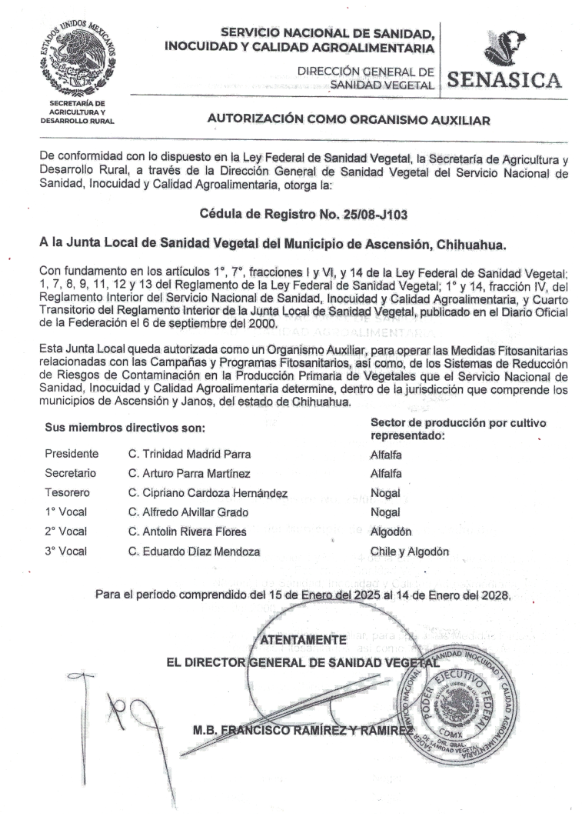 Mesa directiva 2025 - 2028 Junta Local de Sanidad Vegetal Ascensión.